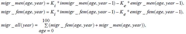 -количество эмигрантов и иммигрантов в зарубежные страны по полу и возрасту в базовом году;