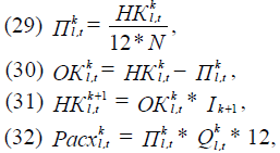 где k ≥t, N – число лет ожидаемого периода выплаты пенсии; П kl ,t –накопительная часть пенсии в k-ом году для новых назначений t-го года l-ой группы заработной платы; ОК kl ,t –оставшийся капитал в k-ом году для новых назначений t-го года l-ой группы заработной платы; Qkl ,t –количество доживших до k-ого года из числа вышедших на пенсию в t-ом году; Расхkl ,t –расходы на выплату пенсии в k-ом году для новых назначений t-го года l-ой группы заработной платы.