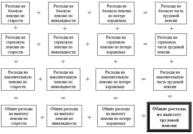 Расчет расходов на выплату базовой и страховой частей каждого из видов трудовой пенсии осуществляется по одинаковой схеме (рассмотрим для примера схему расчета расходов на выплату трудовой пенсии по старости).