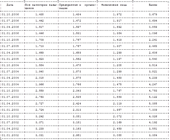 На первый взгляд проблема возникновения кризиса проблемных кредитов в российской банковской системе кажется сегодня не вполне актуальной. Действительно, период после экономического кризиса 1998 г. характеризуется практически непрерывным снижением доли просроченной задолженности в общем объеме ссудной задолженности (Приложение 1). Так, по состоянию на 1 января 2002 г. доля просроченной задолженности составила 3,03%, а на 1 октября 2006 г. - 1,44%. Данный показатель позволяет оценить кредитный риск российского банковского сектора как умеренный, так как согласно международной практике критической величиной является уровень 10%.