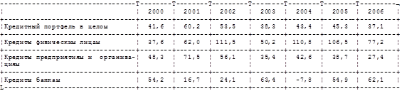 Темпы прироста кредитного портфеля российских банков в 2000-2006 гг. по отдельным категориям заемщиков, %