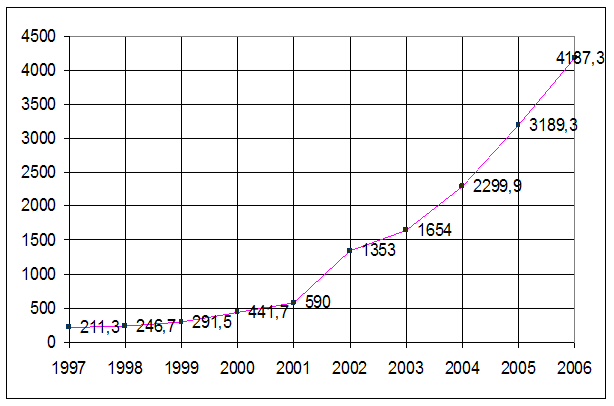 Рисунок 1. Динамика кредитных вложений коммерческих банков в 1997—2006 гг в целом по России (млрд руб.)[30]