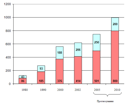 Продовжуються процеси глобалізації наявного грошового обігу - 1 травня в Євросоюз вступили 10 нових держав, на що звернув увагу в своїй доповіді директор Європейського центрального банку по банкнотах Антті Хейнонен (Antti Heinonen). Зростає обсяг наявної грошової маси. За даними і за прогнозами фахівців Федеральної резервної системи США, кількість наявних доларів США в обігу постійно зростає (рис.3.1).