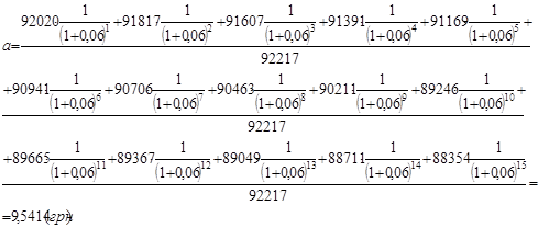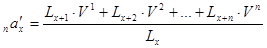 Сучасна вартість загальної суми сплачених всіма страхувальниками наприкінці першого страхового року внесків визначається множенням суми внесків - Lх+1 на дисконтуючий множник - V, тобто Lх+1 × V. Сучасна вартість внесків другого року дорівнює - Lх+2 × V2 , а n -го року - Lх+n × Vn .