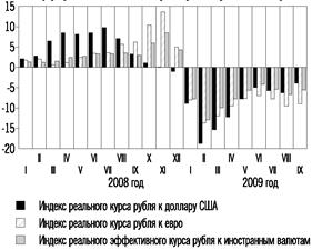 По состоянию на 1 октября 2009 года официальные курсы доллара США и евро к рублю составили 30,0087 рубля за доллар США и 43,8877 рубля за евро, повысившись с начала года на 2,1 и 5,9% соответственно. Реальный эффективный курс рубля к иностранным валютам в сентябре 2009 года по отношению к декабрю 2008 года снизился на 5,6%. [7]