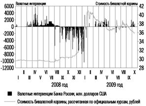 устойчивости валютного курса и недопущения его чрезмерной волатильности обусловил совершение Банком России операций внутри указанного коридора. Таким образом, с февраля 2009 года при проведении курсовой политики Банк России начал использовать плавающий интервал допустимых значений стоимости бивалютной корзины, границы которого автоматически корректируются в зависимости от объема совершенных интервенций Банка России. На начало августа 2009 года было установлено, что при покупке (продаже) Банком России иностранной валюты в объеме 0,7 млрд. долларов США (до июня 2009 года – 0,5 млрд. долларов США) границы плавающего интервала допустимых значений стоимости бивалютной корзины сдвигаются вниз (вверх) на 5 копеек.