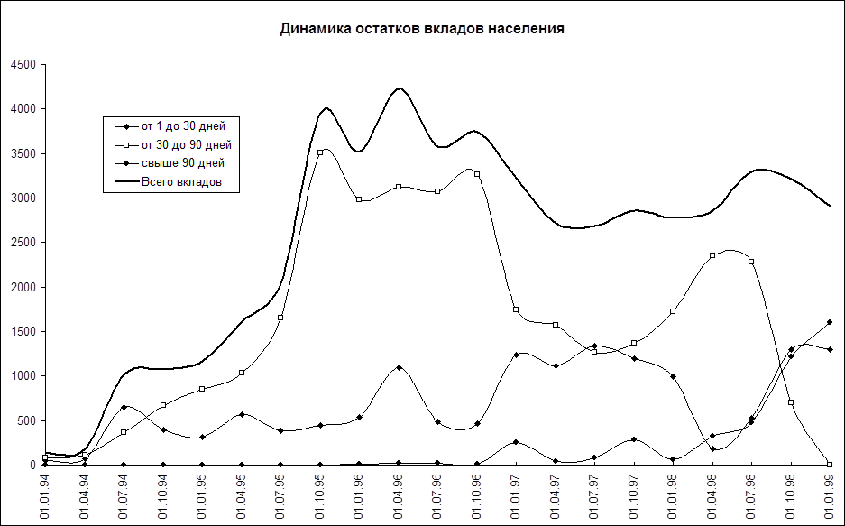 Анализ управления пассивами показал, что по состоянию на 1 января 1999 года сумма привлеченных средств банка увеличилась до 96%, причем основную часть привлеченных средств составляют дорогостоящие ресурсы - срочные вклады населения. Их удельный вес в общем объеме привлеченных ресурсов колеблется от 2% в 1994 году до 87 % на 1 января 1999 года. Такое положение обусловлено тем, что на протяжении 1997-1998 годов в отделении проводились структурные изменения, оказавшие влияние на отношения юридических лиц с банком. А именно, в декабре 1996 года в результате проведенного аукциона на право осуществления санации Агропромбанка произошло слияние двух банков - Агропромышленного банка и Столичного банка сбережения и одним из первых решений АКБ СБС-Агро было решение о переводе отделений на единый корреспонденский счет в региональное отделние банка.