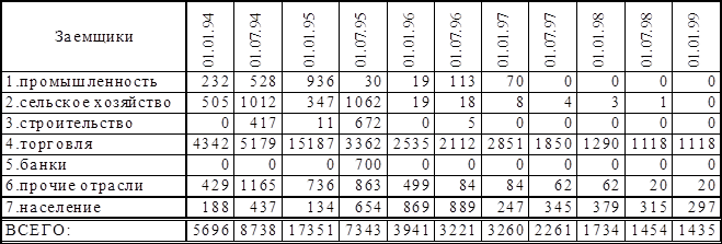 В результате вышеуказанных преобразовний в 1997 и 1998 году отделением не был прокредитован ни один заемщик т.к. ни один заемщик не смог собрать необходимые документы, предоставить ликвидный залог и соответствовать установленным банком требованиям к финансовому состоянмю заемщика.