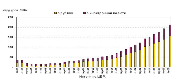 Интенсивный рост объема средств на счетах физических лиц в период 2003–2004 годов следует рассматривать как отражение процесса дедолларизации накоплений граждан. На начало июня 2005 года депозиты и прочие привлеченные средства физических лиц составляли 29, 1% от совокупных пассивов банковского сектора, в то время как на начало 2003 года — 24, 8%. Наиболее динамичной компонентой депозитной базы выступили рублевые вклады со сроками более 1 года: за указанный период их объемы увеличились примерно в 3, 9 раза, обеспечив примерно 20% прироста совокупных пассивов банковского сектора.