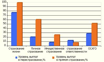 Рисунок 2. Уровень выплат в различных видах на рынках перестрахования и прямого страхования в 2005 году, %[5]