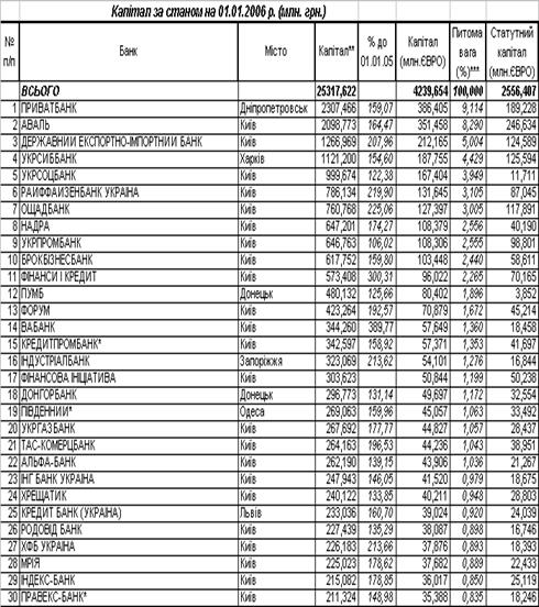 Таблица Б.3 Власний капитал перших 30 банківських установУкраїни станом на 01.01.2006 року [37]