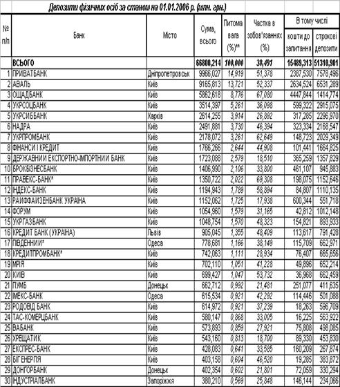Таблица Б.4 Депозити фізичних осіб в перших 30 комерційних банках України станом на 01.01.2006 року [37]