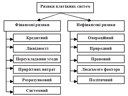 Платіжним системам притаманний значний рівень ризику в кількох областях, що пояснюється обсягом та розміром виконуваних у цих системах операцій. Причому цей ризик стосується і учасників, що здійснюють перекази коштів, і операторів системи. Ризики платіжної системи мають широкий спектр: на них наражаються платіжні інструменти, системи доставки, зв’язку, механізми клірингу та розрахунків, а також грошово-кредитний сектор економіки.
