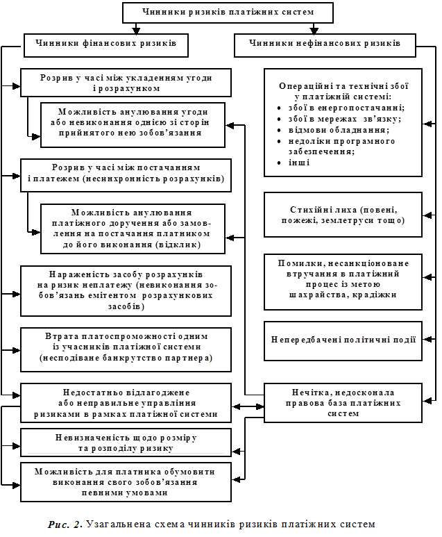 Ризики необхідно розглядати в сукупності з чинниками, оскільки лише шляхом зменшення рівня невизначеності інформації щодо цих чинників можна створити досконалу систему управління ризиками. На основі аналізу основних чинників ризиків платіжної системи приведемо систематизацію їх за типами ризиків, які вони спричиняють (рис. 2).