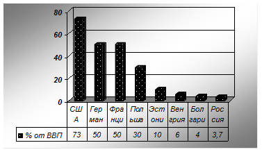 Во-первых, рост реальных доходов населения увеличивает число платежеспособных потенциальных заемщиков. [3, стр. 28 ] По данным Банка России, денежные доходы населения за 7 лет выросли более чем в 7 раз (с 1 776 млрд. руб. – на 1 января 1999 г. до 13 552,5 млрд. руб. – на 1 января 2006 г.) [7] Более высокий уровень доходов обусловливает опережающий рост потребностей, которые выходят за узкие рамки платежеспособного спроса. В результате возникает внешне парадоксальная ситуация, когда с увеличением слоя зажиточных граждан усиливается потребность жить в долг. Для сравнения: задолженность по потребительским, в том числе ипотечным кредитам в США составляет 73% от ВВП, в Германии и во Франции – 50%, в странах Западной Европы – 50%, а в России – 3,7% от ВВП (см. рис. 2). Потенциал роста рынка потребительского кредитования в России, по оценкам ЦЭИ ММИЭИФП, составляет около 10% ВВП. Иными словами, в предстоящие годы следует ожидать утроение его объемов по отношению к ВВП. [3, стр. 28]