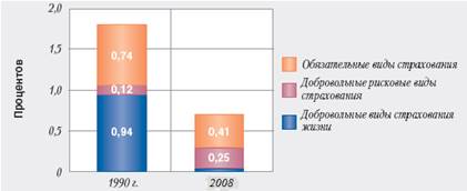 По состоянию на 1 января 2009 г. на страховом рынке Республики Беларусь действовало 24 страховых организации, которыми за 2008 г. получено 666,1 млрд. рублей страховых взносов и выплачено физическим и юридическим лицам страхового возмещения на сумму 344,4 млрд. рублей. Таким образом, за 2008 г. доля страховых взносов в ВВП составила 0,7%. Положительным фактом является удвоение доли в ВВП поступлений по рисковым видам страхования по сравнению с 1990 г. (с 0,12 до 0,25%) (рисунок 1).