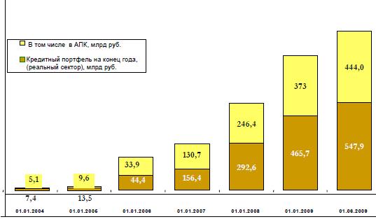 Сейчас банк в своей деятельности особое внимание уделяет обеспечению доступности кредитных ресурсов, совершенствованию форм и механизмов кредитной поддержки сельхозтоваропроизводителей как в целом, так и в рамках реализации Государственной программы развития сельского хозяйства. За первое полугодие 2009 г. размер кредитного портфеля банка увеличился более чем на 90 млрд. руб. и достиг 557 млрд. рублей.
