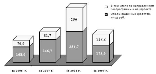 Согласно расчету из общего объема кредитования сельского хозяйства на «Россельхозбанк» в текущем году должно приходиться около половины средств. Намечалось выдать краткосрочных кредитов на сумму 218,6 млрд. руб. и долгосрочных – 192,4 млрд. руб. По сравнению с 2008 г. объемы кредитования должны возрасти более чем на 70 млрд. руб. Председатель Правительства РФ поставил задачу перед пятью государственными банками обеспечить рост кредитного портфеля реального сектора экономики в течение июля-октября не менее чем на 150 млрд. руб. ежемесячно.