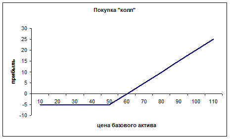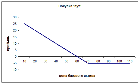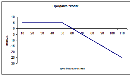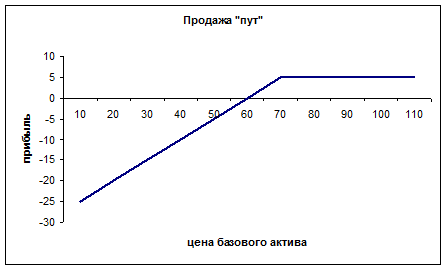 Из рисунков 2.1 и 2.2 хорошо видно, что при страйке 60 усл. единиц убыток покупателя этих опционов в случае развития неблагоприятной ситуации на рынке может составить только 5 усл. единиц, а прибыль почти ничем не ограничена. Но если взглянуть ниже на рисунок 2.3 и 2.4, то нетрудно понять что убыток продавца этих опционов будет ничем не ограничен, а максимальное вознаграждение составит только 5 усл. единиц, (размер премии).