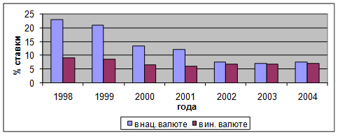 На протяжении 1998—2004 лет наблюдается тенденция к уменьшению ставок по депозитным вкладам, в национальной валюте уменьшение почти втрое, в иностранной — в 1,6 раз. При этом за последние три года ставки по депозитам, как в национальной, так и в иностранной валюте практически не изменились, что свидетельствует об определенной стабильности на рынке депозитных вкладов.