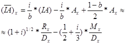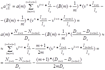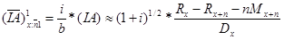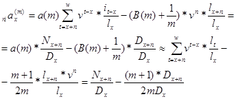 | В виде пожизненной ренты, отсроченной на n лет, выплачиваемой m раз в году | 1/m, m раз в год, в конце каждого 1/m интервала времени | Первая выплата при достижении возраста x + n + 1/m лет | ![]() |