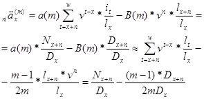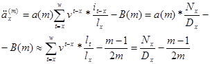 | В виде пожизненной ренты, выплачиваемой m раз в году | По 1/m, m раз в течение страхового года в начале каждого 1/m интервала времени | Первая выплата немедленно после начала договора страхования, последующие – в начале каждой m-ой части года | ![]() |