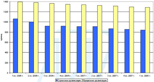 Тенденция сокращения численности характерна как для страховых, так и кредитных организаций в последние два года с одинаковым темпом около 1% ежеквартально. Исключение для страхового рынка составили 2 квартал 2006 года (число страховщиков уменьшилось на 6%), 3 квартал 2006 года – сокращение на 8% и 3 квартал 2007 года – на 5%. Данные скачки обусловлены поэтапным усилением требований страхового законодательства к размеру минимального уставного капитала страховых организаций. У компаний, не обладающих достаточным уставным капиталом и не сумевших его своевременно увеличить, страховым надзором были отозваны лицензии на осуществление деятельности по мере сроков вступления в силу соответствующих более высоких требований Закона «Об организации страхового дела в Российской Федерации».