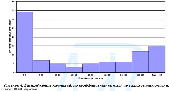 Распределение компаний, осуществляющих страхование жизни, по коэффициенту выплат свидетельствует о большом числе компаний, только начинающих работать на этом рынке. Основная часть – это крупные международные компании, вышедшие на российский рынок за последние два года. Высокая доля компаний, с коэффициентом выплат более 120%, в большинстве своем обусловлена наличием страховщиков, которые продолжают обслуживание договоров страхования жизни, но уже не специализируются на данном рынке.