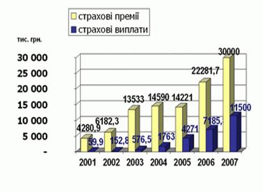 Рис.2.3.1 Збір страхових премій по відношенню до страхових виплат в динаміці 2001 – 2007рр.