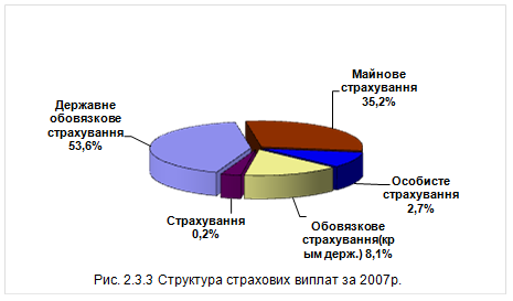 Фінансова стійкість страхового бізнесу компанії характеризується як кількістю договорів, так і рівнем диверсифікації портфеля страхових премій і страхових платежів. Перший показник у Стрийського міського відділення НАСК «Оранти» покращав - кількість договорів страхування в т.ч., як було відмічено вищим, збільшилося з 4.72 тис. до 9.22 млн., а про другому показнику можна судити по структурі страхових премій і виплат (див.рис.2.3.2), яка говорить про диверсифікацію рисок, з якими працює компанія.