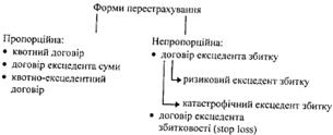 Існує безліч різних за формою перестраховувальних договорів. Немає стандартного, спільного для всіх страхових компаній договору.У кожному окремому випадку договори перестрахування мають своїпевні особливості, різняться частками участі у договорі, ставками премії, власним утриманням. Проте всі договори можна поділити на дві основні групи, що різняться системою розподілу ризиків між перестрахувальником і перестраховиком. До них належать пропорційна і непропорційна форми проведення перестрахувальник операцій (рис. 2.).