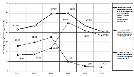 У 2006 році види страхування за якими частка перестрахування у пере-страховиків-нерезидентів становила більше 20% від валових премій отриманих за такими видами розподілились наступним чином [19]: