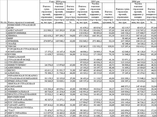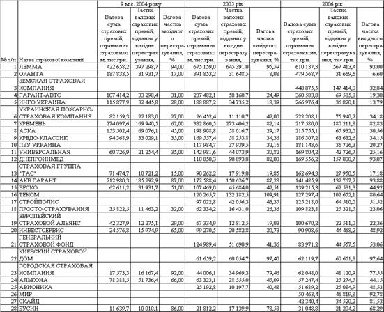 Як показав аналіз, проведений в роботі, політика перестрахування не залежить від рівня валових страхових премій, так рівень перестрахування в страхових компаніях України, які займають перші місця рейтингу за обсягами валової премії у 2006 році становлять: