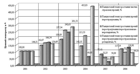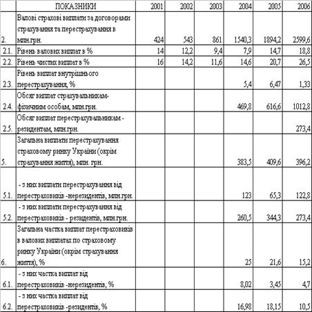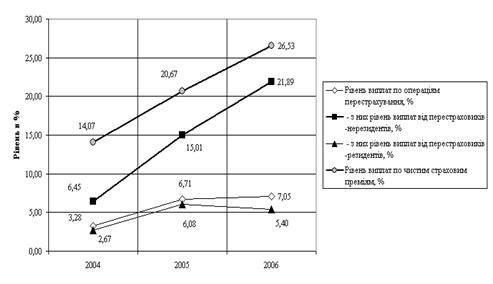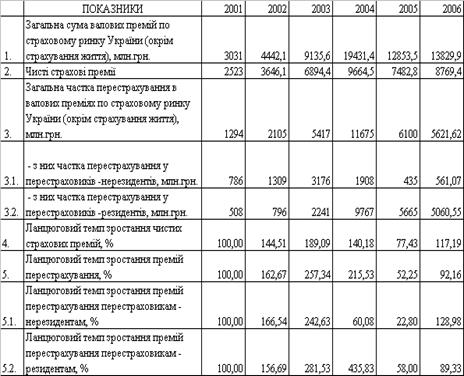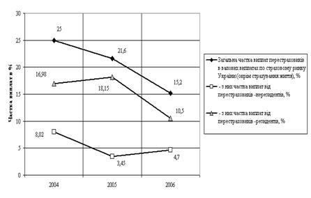 За договорами вихідного перестрахування ризиків на кінець 2006 року українські страховики (цеденти, перестрахувальники) сплатили 5 621,6 млн. грн., що становить 41% від валових страхових премій по ринку страхування України, з них: