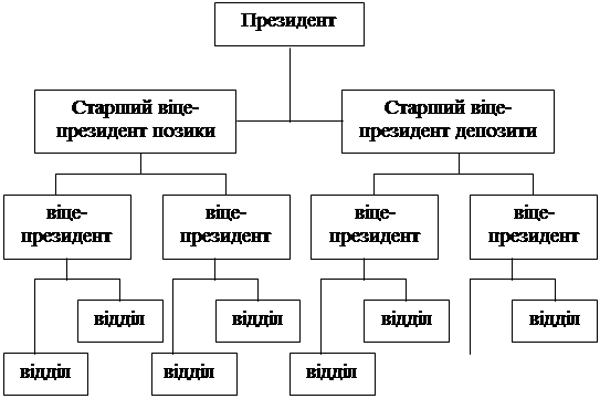 Структура банку, кількість відділів, спеціалізація служб, склад керівництва, розподіл повноважень і т.д. залежить від багатьох факторів і визначається економічною доцільністю.