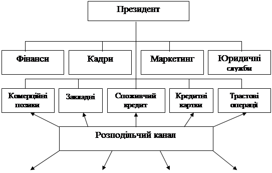 Це більш висока форма організації компанії ніж вищерозглянута система. Прикладом типового профіт-центру може слугувати трастовий відділ банку, фугкції якого в значній мірі обособлені і це дозволяє досить чітко оцінити затрати та результи роботи відділу. Структура банку з окремими профіт-центрами показана на мал.4.