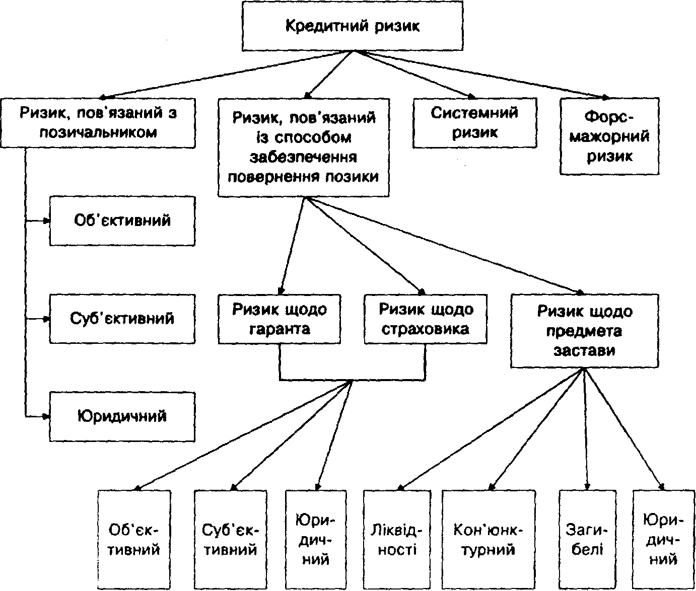 Кредитний ризик представляє собою цілу сукупність ризиків, повязаних з учасниками і елементами кредитних відносин (див. рис 1.1. ; табл. 1.1.)