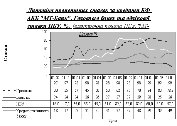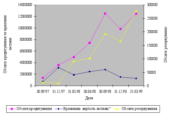 На 01.04.98 року нестандартні кредити складали 46% загального обсягу заборгованості, на яку нараховуються резерви , в тому числі безнадійні – 18.4% на суму 644.7 мільйонів гривень.( 3 ). На 01.10.98 року обсяг безнадійних кредитів збільшився до 700 мільйонів гривень, а питома вага нестандартної заборгованісті за позичками зросла до 46.5% від загального обсягу.(42, с.44).