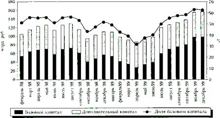 В 1998 г. банки начали пересматривать структуру выдаваемых ими кредитов (см. рис. 1). Рост процентных ставок и угроза девальвации подорвали механизм рублевого кредитования реального сектора. В связи с этим банки изменили структуру кредитного портфеля: если в начале года доля валютных кредитов в среднем по банковской системе составляла 35%, то к лету она достигла 41%, а у отдельных банков - 70%. Суммарная доля кредитов экономике находилась на уровне 32-33% от банковских активов.