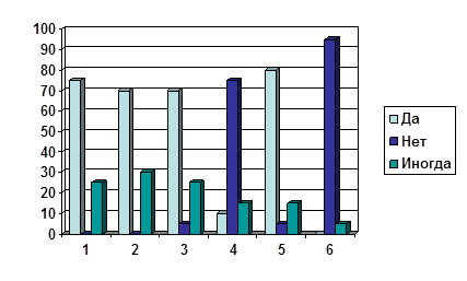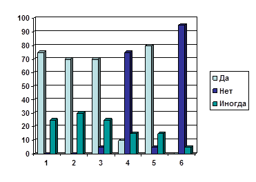 Эти традиции способствуют преодолению одиночества, беззащитности, воспитывают умение быть Человеком. Всему этому способствует разнообразная совместная деятельность, которой умело руководит Валентина Петровна, опираясь на актив детей и родителей. Наблюдая за детьми этого класса в течение четырех лет и регулярно беседуя с учителем, можно отметить, что класс действительно сплоченный, ребята приходят на помощь друг другу, переживают за успехи и неудачи одноклассников. В классе царит атмосфера доброжелательности, взаимопомощи. О том, что детям в классе комфортно, подтверждают результаты анкетирования. Оно состояло из шести вопросов.