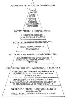 Согласно А. Маслоу, в индивидуальном развитии человека потребности возникают последовательно: физиологические, в безопасности, в любви, уважения (почитания), познавательные, эстетические, в самоактуализации (24).