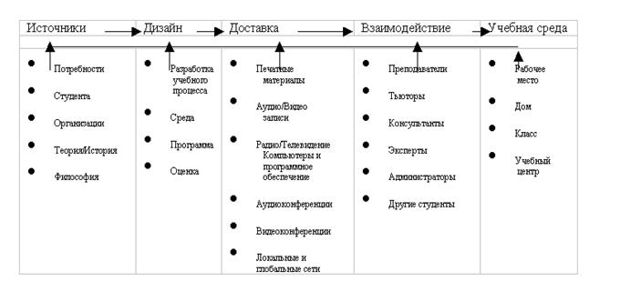 Существует несколько моделей дистанционного обучения, представляющих его как систему взаимосвязанных компонент. Рассмотрим две наиболее популярные модели. Первая модель описана в книге Michael Moore «Distance Education. A Systems View» и может быть представлена в следующем виде (Рисунок 1)
