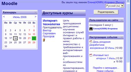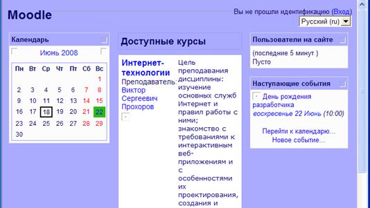 В данном случае это курс «Интернет-технологии». В этом окне студент может ознакомиться с целью курса, а так же с преподавательским составом. Для него доступен список наступающих событий, календарь и информация о времени нахождения пользователей на сайте (рисунок 17).