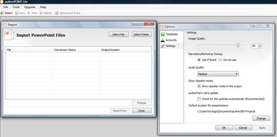 Для того, чтобы экспортировать презентацию во flash-объект в программе AuthorPoint Lite, необходимо запустить программу и выбрать необходимые презентации, после чего в меню Tools->Options выбрать необходимые параметры: цвет, тему, качество изображения и аудио. После этого можно приступать к импорту .ppt файлов во flash, нажав клавишу «Import now». На выходе пользователь получает не только .swf файл, но ещё и .html страницу, которую можно так же использовать в качестве презентации.