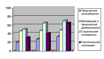 Таким образом после проведения программы «Одаренные дети», и программы «Бездарных детей не бывает». Мы смогли получить позитивные результаты и сделать выводы о том, что социальная активность возросла особенно в театральной студии. Гностический компонент вырос в объединении самопознания и на факультативах «познай планету». Творческая деятельность и мотивация к творчеству выросли во объединения почти одинаково.