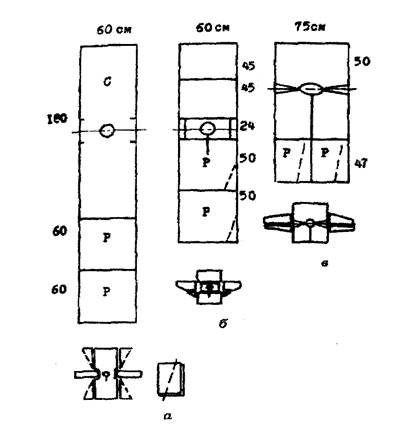 Рис. 1. Схемы раскроя женских рубах: а - туникообразных; б - на кокетке; в - с плечевыми швами. Условные обозначения: С - стан: Р - рукав.