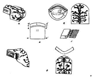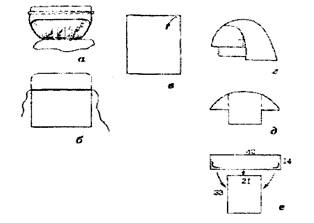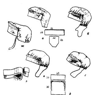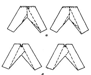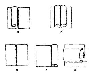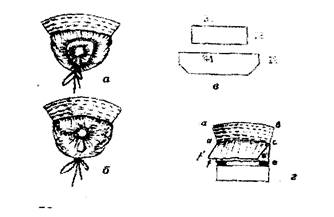 Рис. 4. Технологические приемы шитья в рубахах: а, б - швы соединения верха со станом; в - швы соединения полотен стана; г, д - обработка низа стана