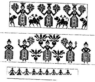 6. Этот узор был вышит на подоле женской рубахи 50 лет назад. Сравни его с орнаментальными узорами. Что в них общее? Чем отличается данная вышивка? Упрости узор и вышей его на платье для куклы