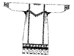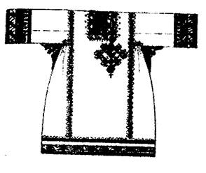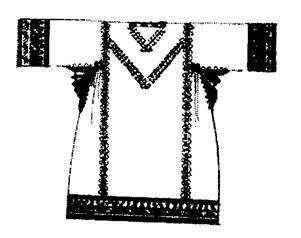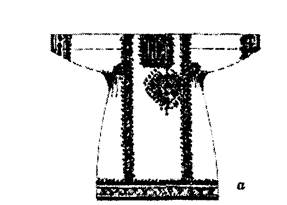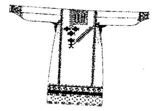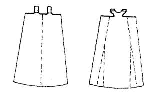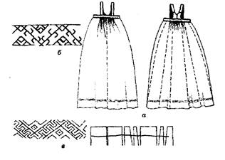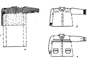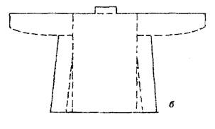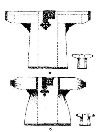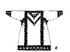Туникообразные рубахи. Еще в начале - первой трети XX в, в Алтайском округе сохранялись, а кое-где встречаются и сейчас, реликтовые, туникообразного покроя женские рубахи, называвшиеся становины, пропускнушки. Основу стана в них составляло перегнутое по утку полотно с пришитыми по сторонам 2-мя прямыми или 4-мя кошеными бочками (боковинами). Рукава в таких рубахах вшиты в пройму, образуемую центральным полотном и более короткими боковинами (рис. 1, а).