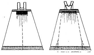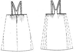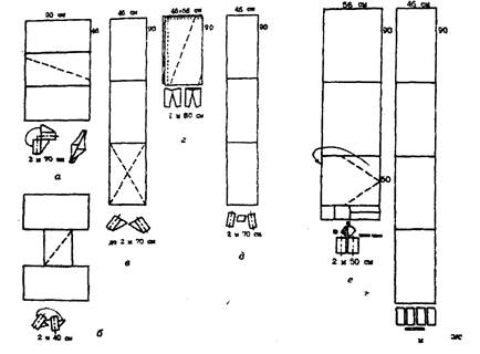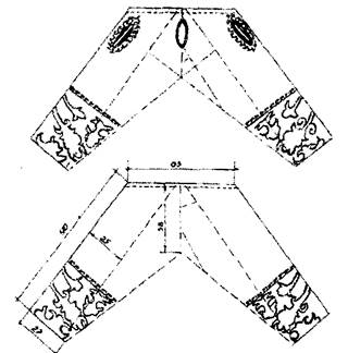 Показанные информаторами способы раскладок кроя дают представление об очень рациональных, безостатковых раскроях (рис. 1). При их выполнении руководствовались традициями, а также шириной тканого полотна (35 - 60 см), которая ограничивалась размерами ткацкого станка - "кросен". Если при крое все же получались небольшие остатки (как правило, в более поздних вариантах), то они использовались на обшивку ворота, низа рукавов.